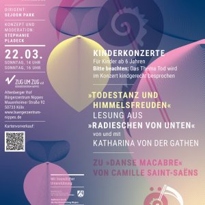 »Todestanz und Himmelsfreuden« zu Camille Saint-Saëns: Danse Macabre mit Lesung aus »Radieschen von unten« von Katharina von der Gathen. Für Kinder ab 6 Jahren Die Musik im „Dance macabre“ von Prokofiev stellt die Stille und das Düstere, das Ungewisse des Todes dar. Aber ist Sterben wirklich schlimm, fragt Katharina von der Gathen in ihrem Kinderbuch „Radieschen von unten“? Kann […]